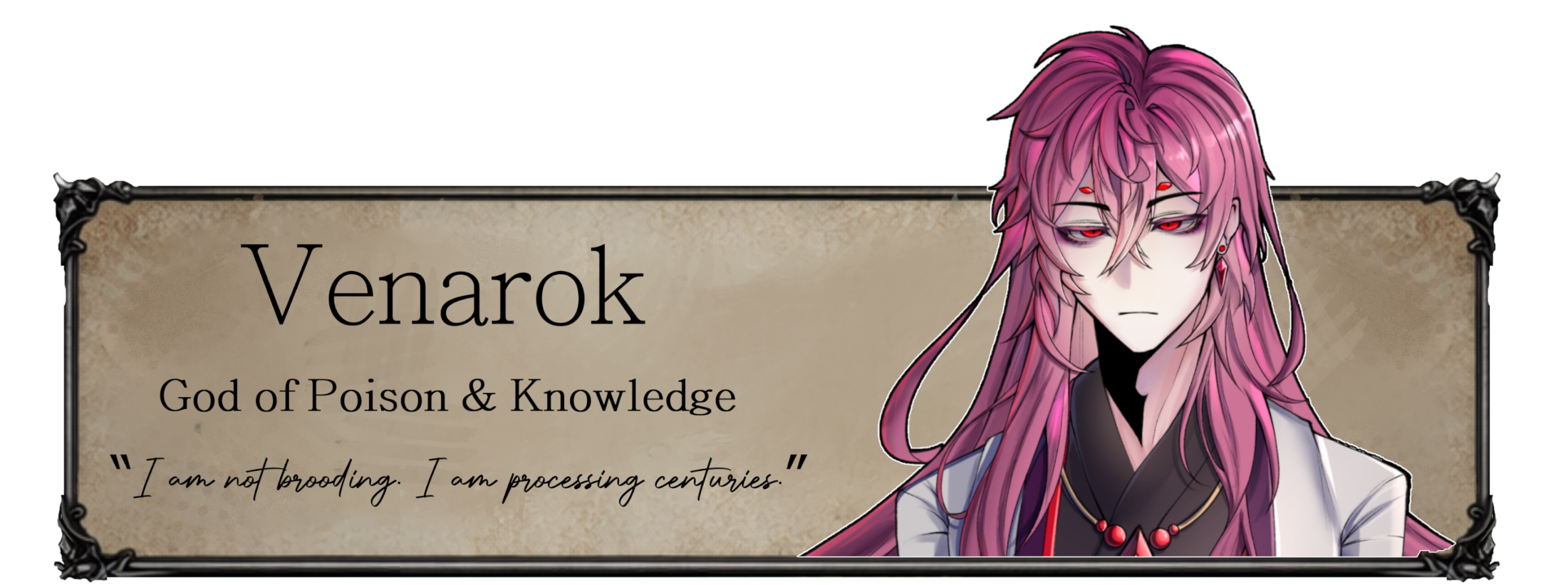 Haunted Divinity is a narrative-driven visual novel centered on Venarok, a fallen god of poison and knowledge long feared for the monsters born of his sorrow.